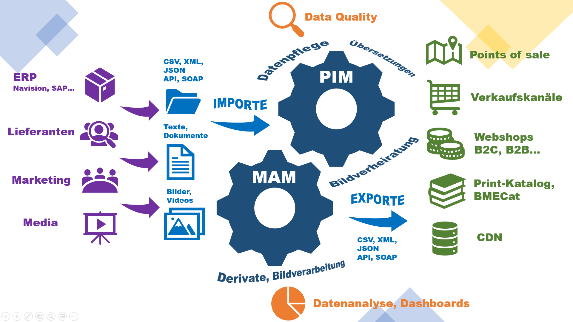 Wir haben Schnittstellen für Produkt- und Bilddaten programmiert, die seit mehreren Jahren zahlreiche Kunden und Partner in ihrer Digitalisierungsstrategie unterstützen und Umsätze in der Onlinewelt generieren. Die bekanntesten digitalen Plattformen, wie Akamai, Tradebyte, Mobimedia, Azure, Onedrive, Comet etc… beliefern wir mit Produktdaten und Bildern aus PIM und MAM.